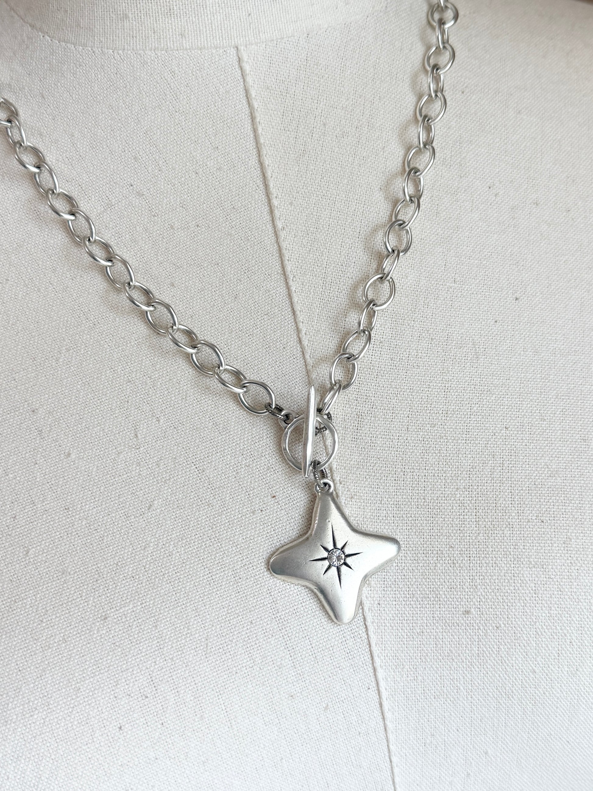 The Aurora is a rounded four-point star necklace featuring a faceted crystal center that adds a soft, twinkling shimmer. Handcrafted in our studio with a silver paperclip chain, this lightweight statement piece blends modern simplicity with a touch of celestial charm. The star pendant measures 36mm tall by 33mm wide and is cast in a substantial metal base with a quality silver-plated finish.