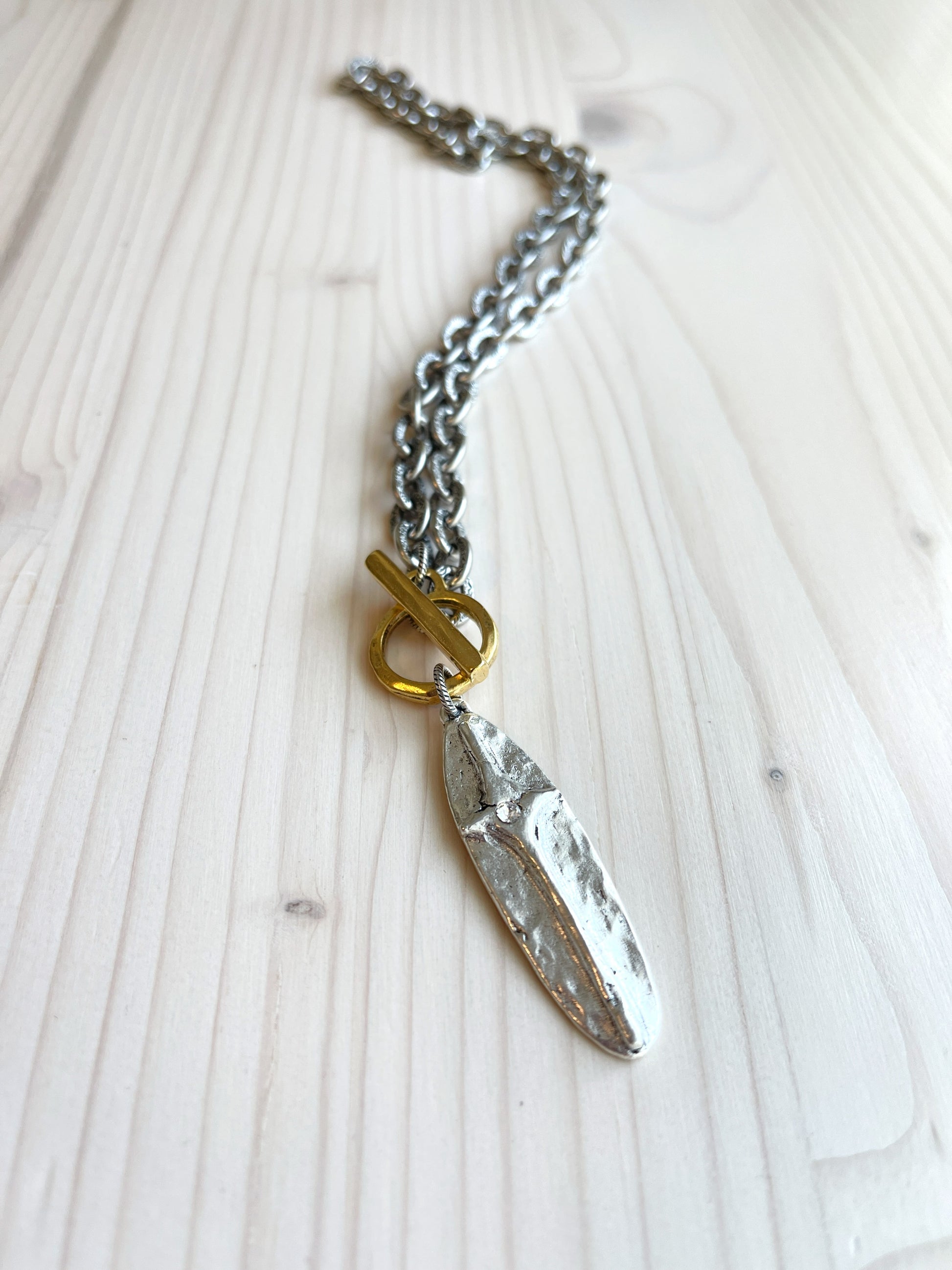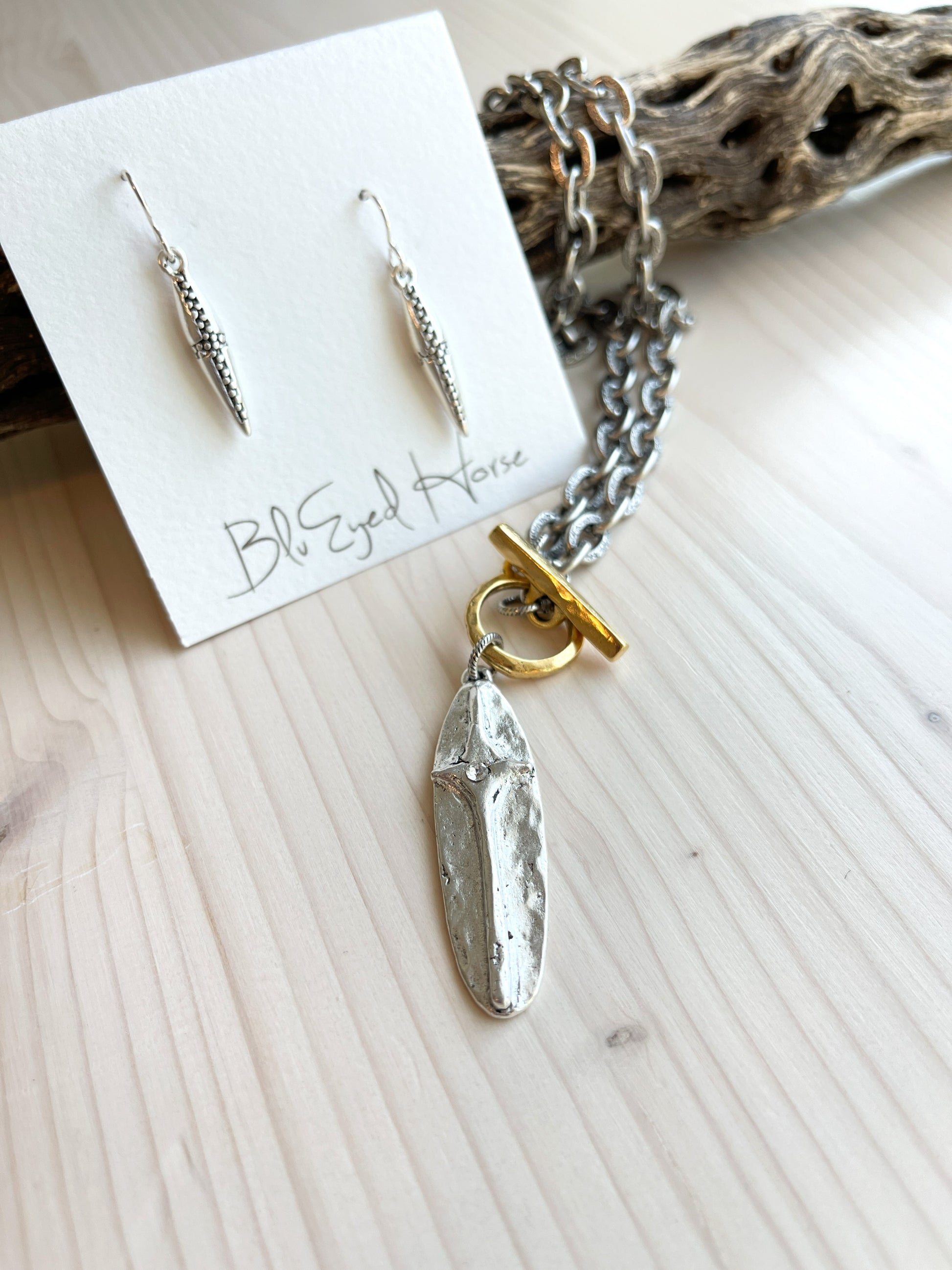 Long oval hammered silver cross with Swarovski crystal detail. 12K Gold over brass hammered toggle clasp for easy front closure and a heavy oval detailed antique silver chain. Chain measures approximately 18 inches in length, pendant adds additional 1.5 inches. Wear this with anything!