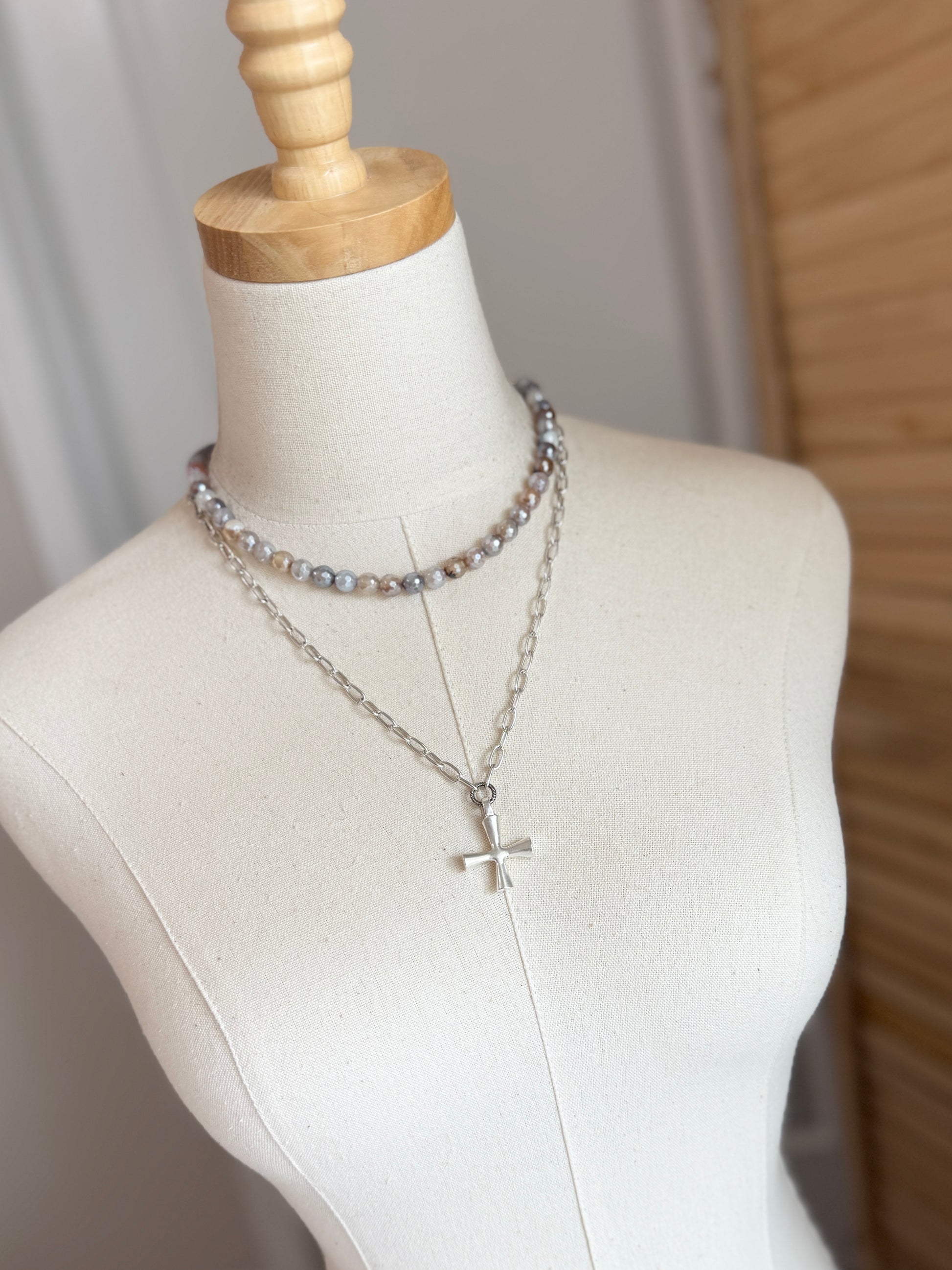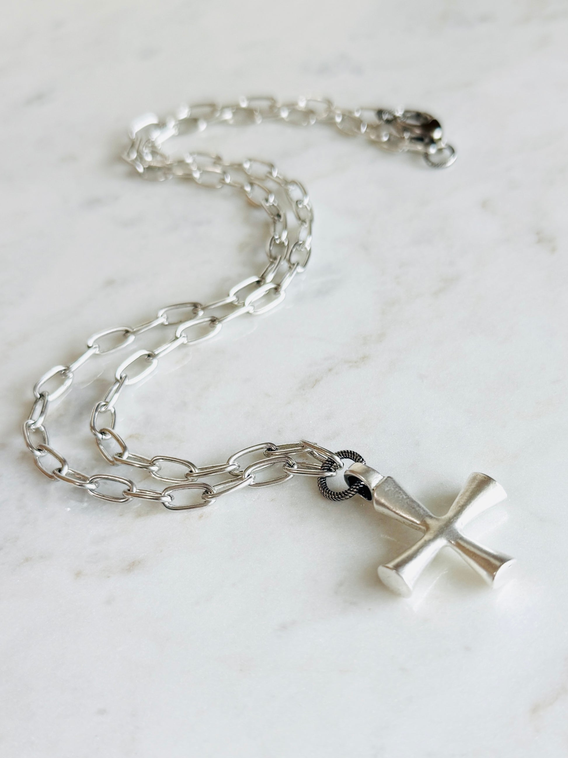 The Laguna is an old-world inspired Maltese cross necklace handcrafted in our studio. Designed with a classic open oval-link silver chain, it feels both vintage and modern—simple, elegant, and effortlessly statement-making.