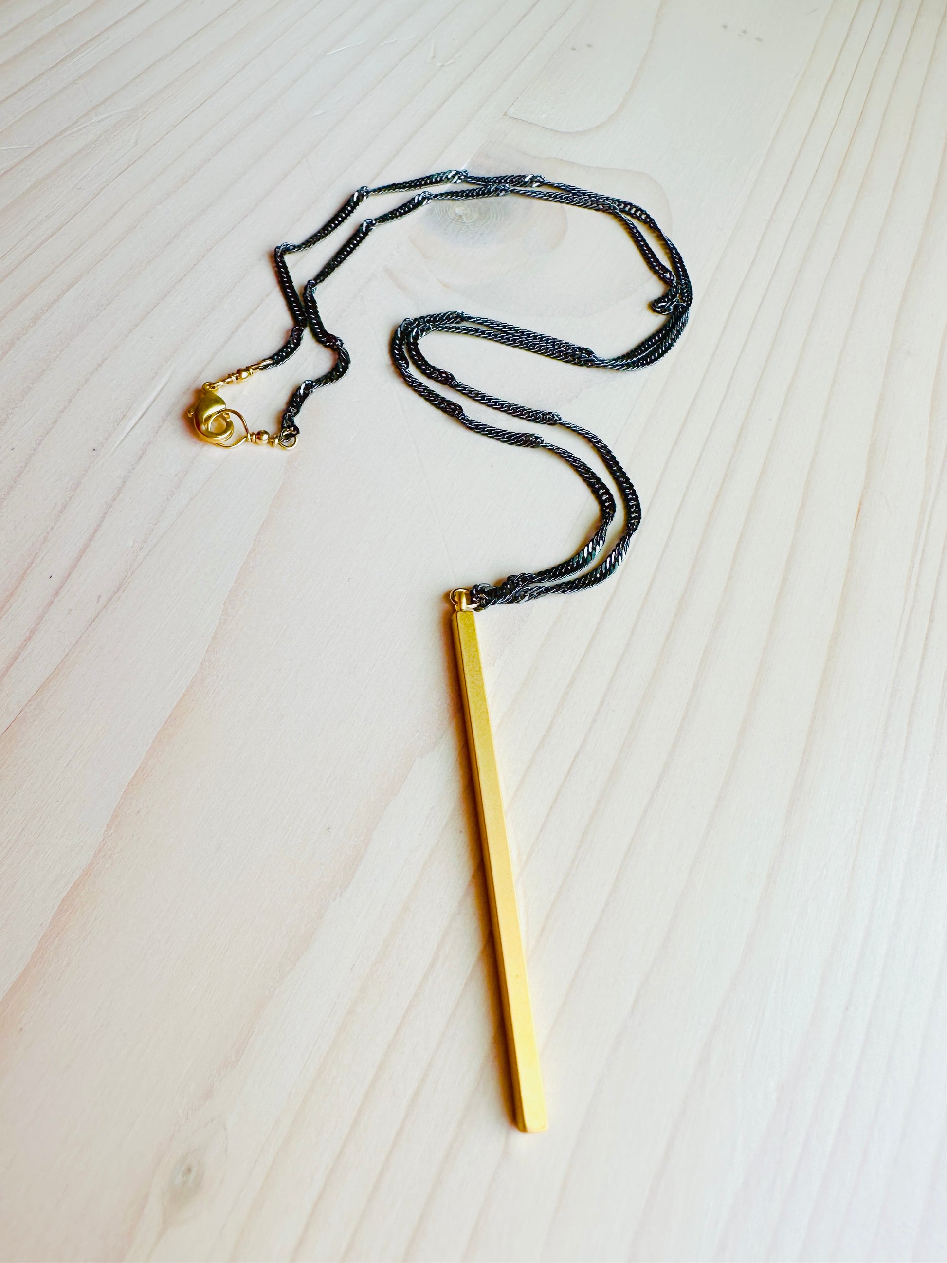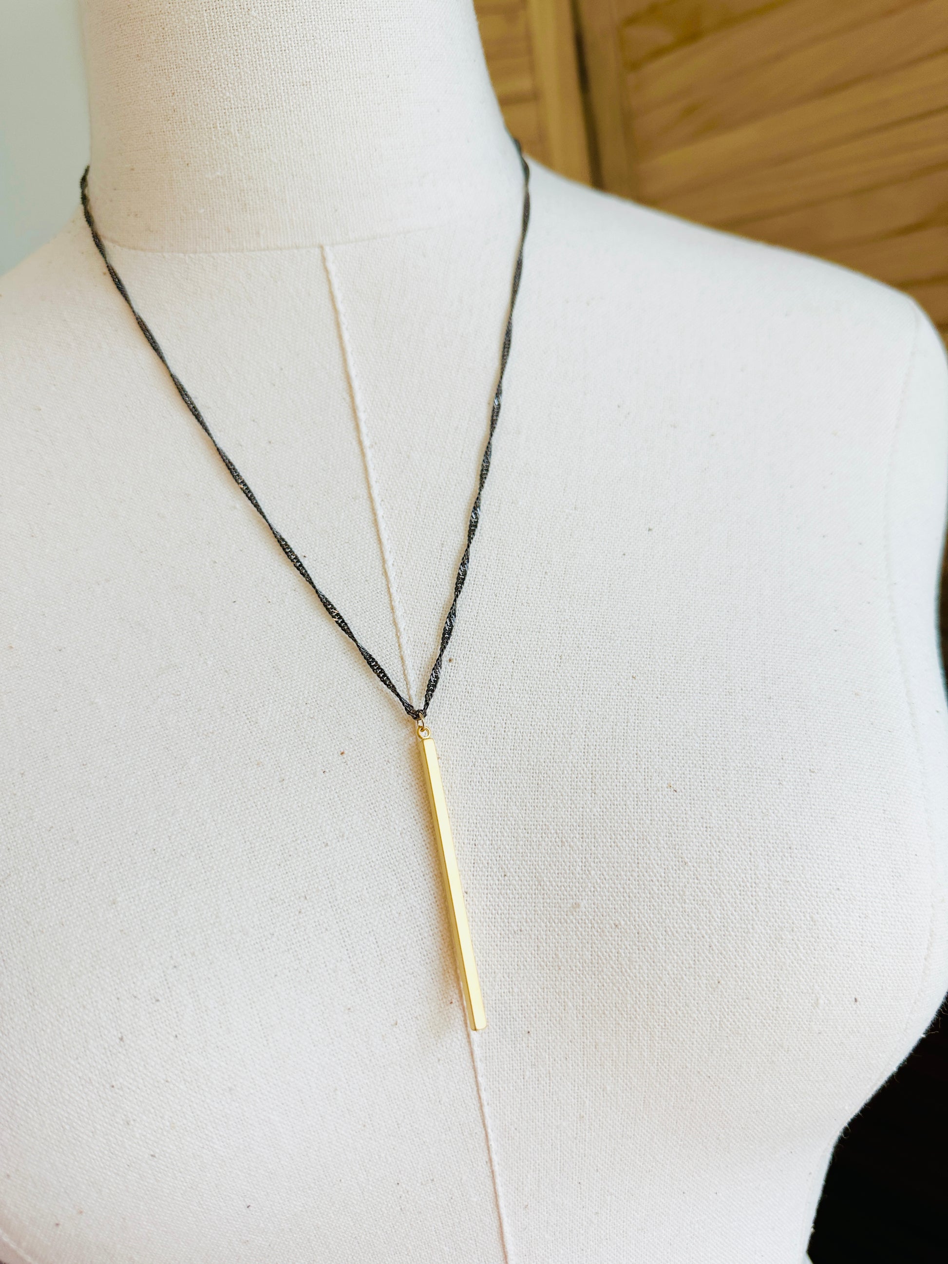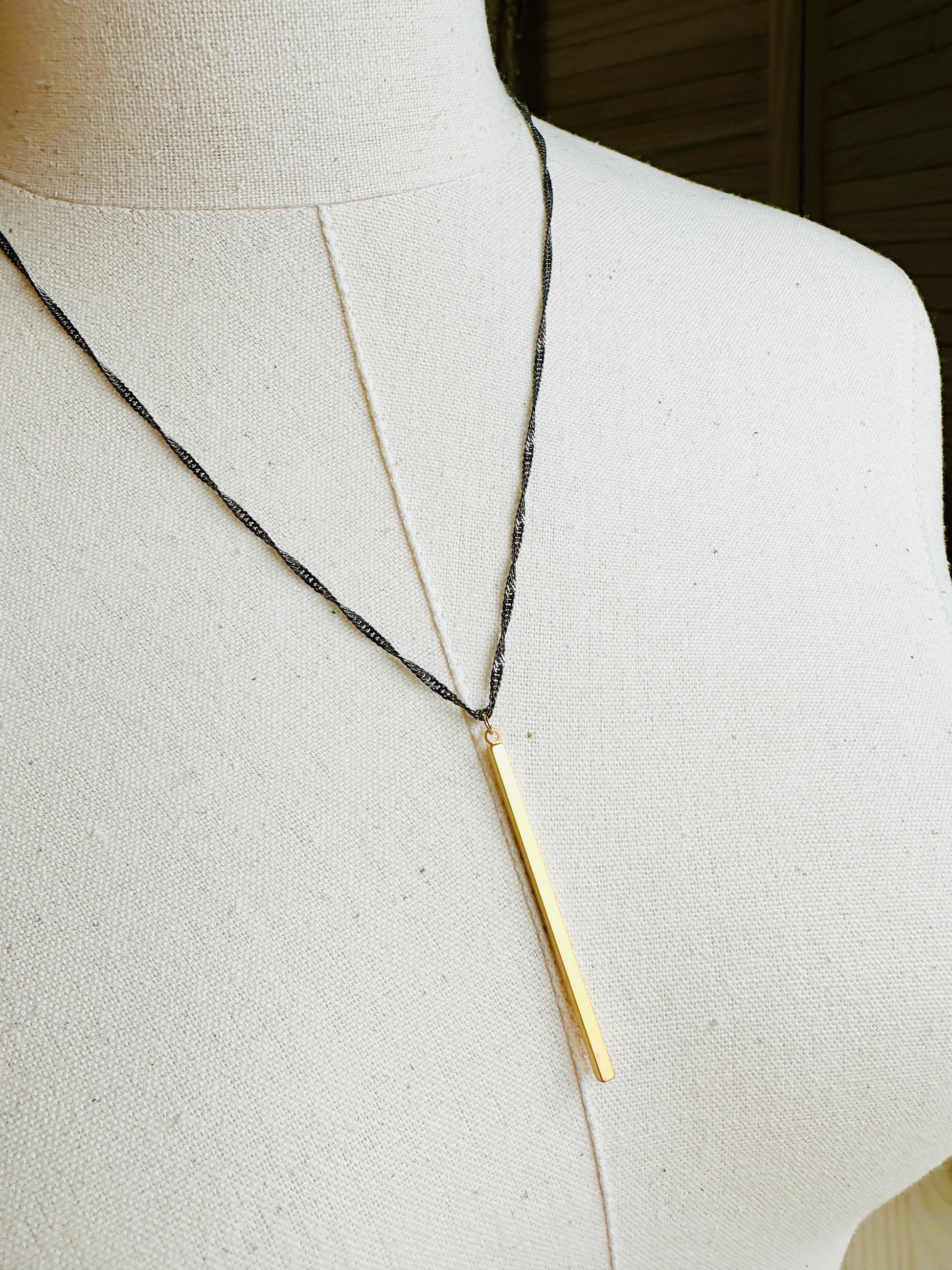 Simple but striking necklace with a 2” 16K Gold plated drop bar pendant on rich glossy twisted gunmetal chain. Necklace measures 22” inches in length and closes with a Gold-filled lobster clasp. Perfect for year-round, jeans or dress-up.