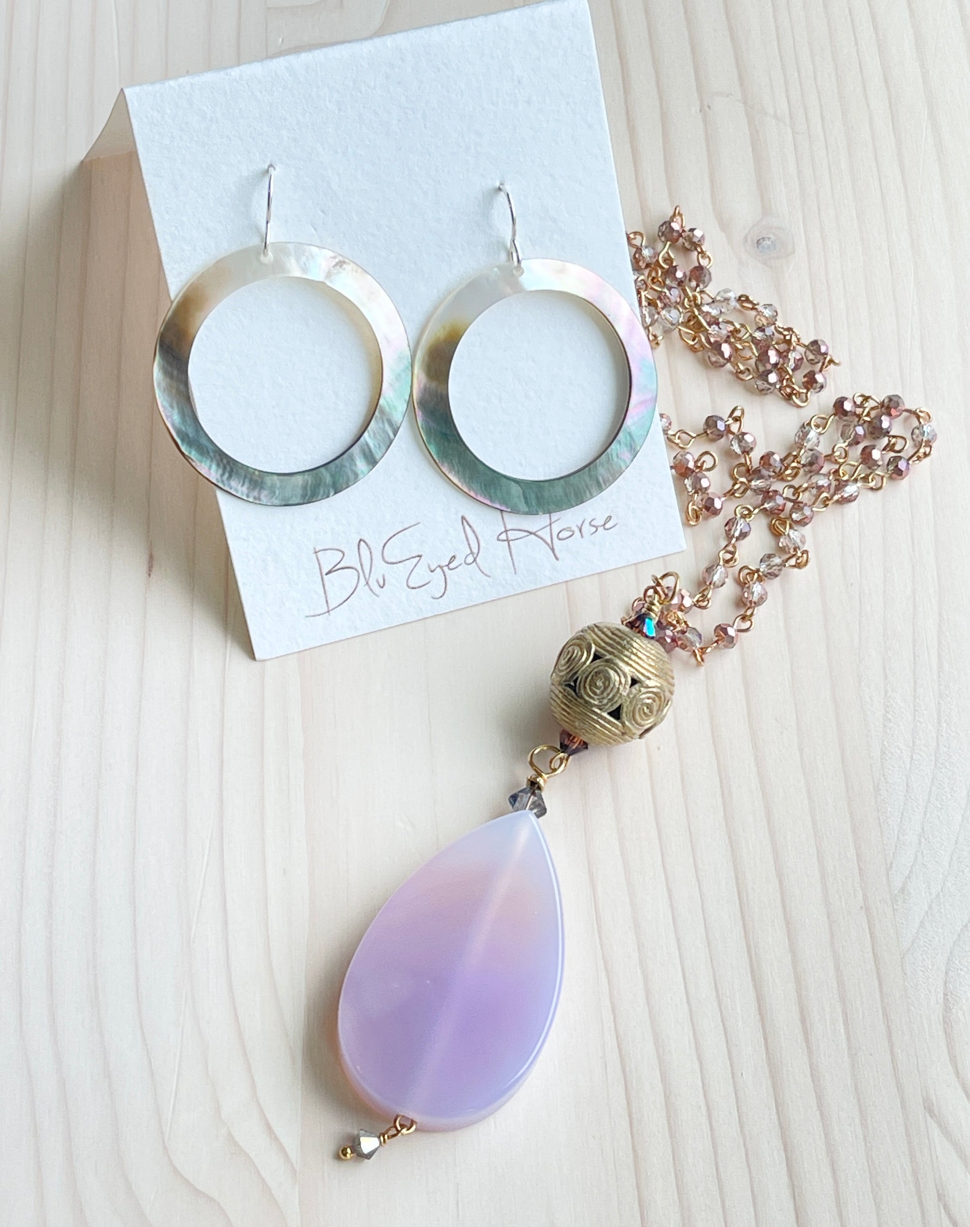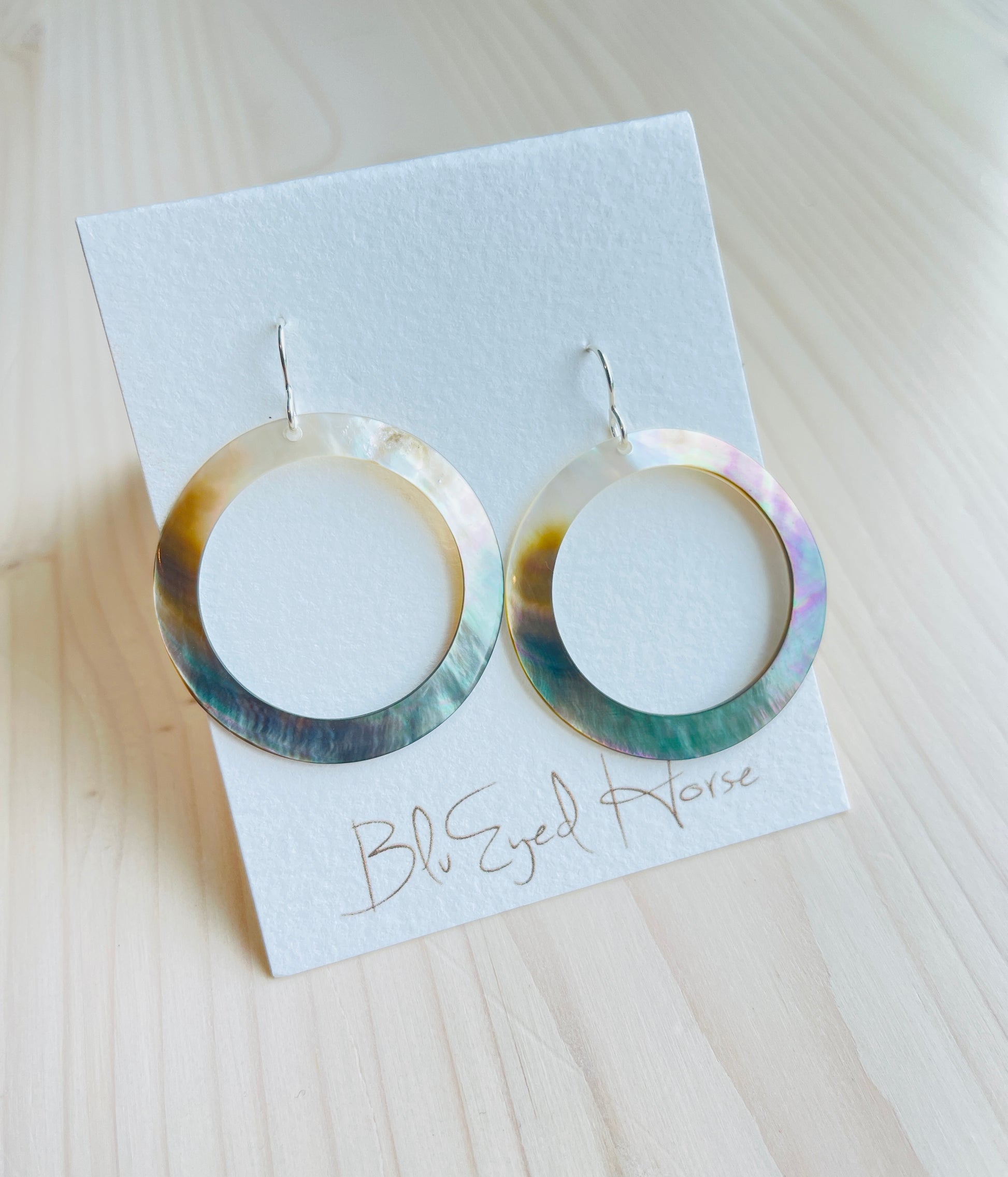 Natural Mother of Pearl hoops earrings. These gorgeous shells have an iridescent quality that pick-up an array of colors in different lighting. And because they are a natural shell, the color may vary slightly. These are approx. 1.5 inches in diameter, are lightweight and versatile. Non-Allergan silver plated ear wires. Nickle free and lead free.