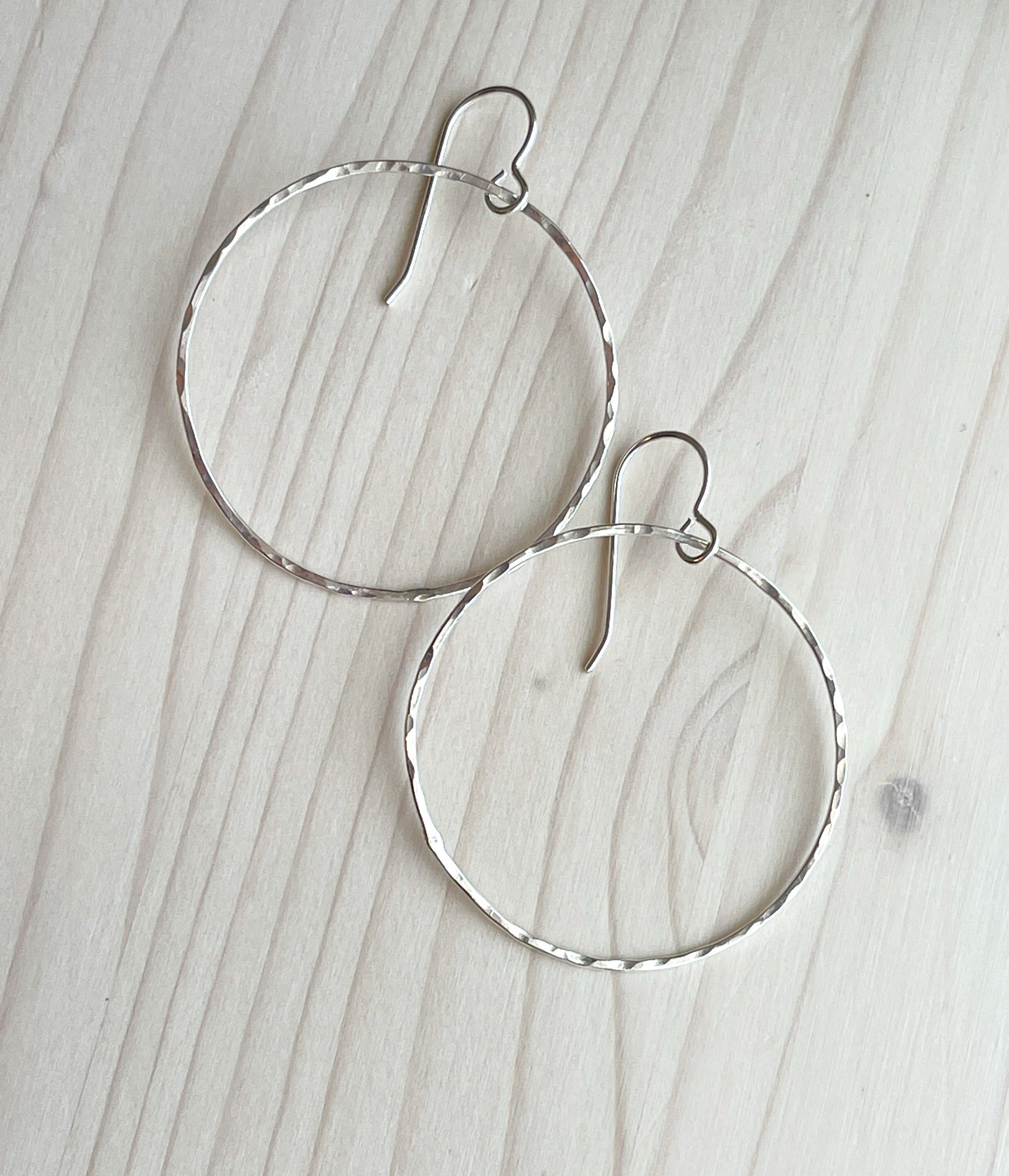 Simple and classic Sterling Silver hammered wire hoops. They measure approximately 1.5 in diameter and 2 inches from the top of the ear wire. These are very lightweight and perfect for everyday.