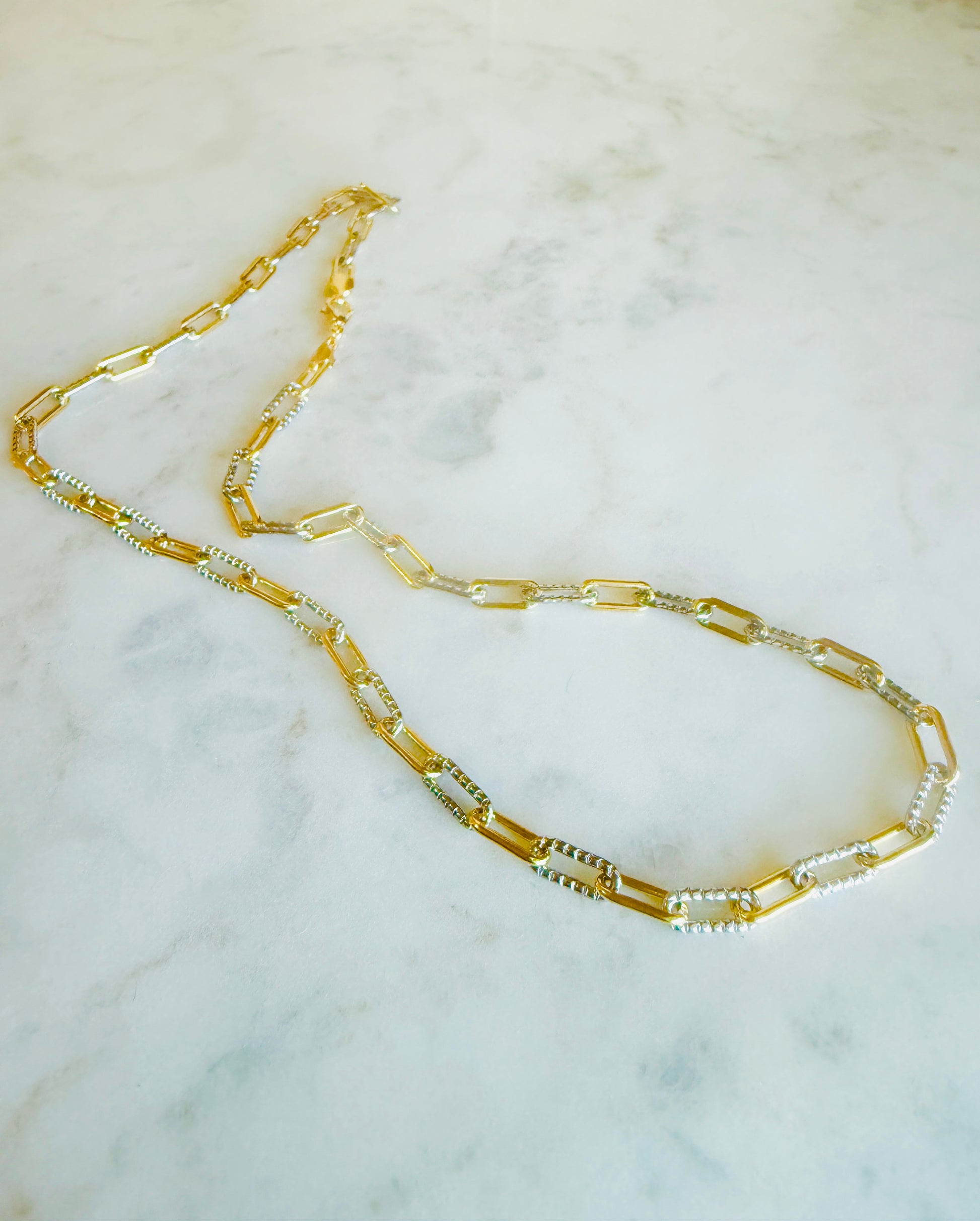 The Unity Necklace brings together contrast and connection in one effortlessly wearable design. Each interlocking paperclip link features a soft texture and a refined mix of 18K gold-filled and 18K rhodium-filled finishes — blending warm and cool tones in perfect harmony.